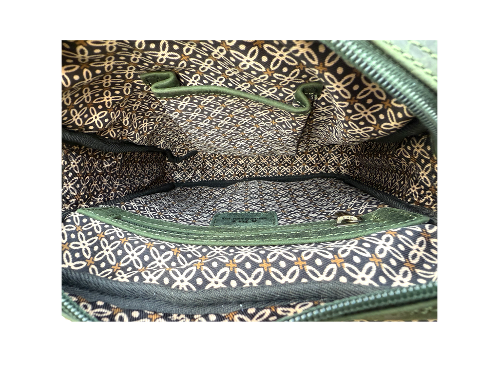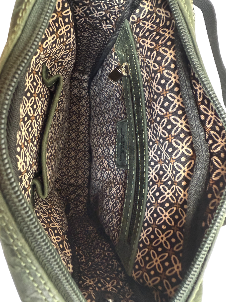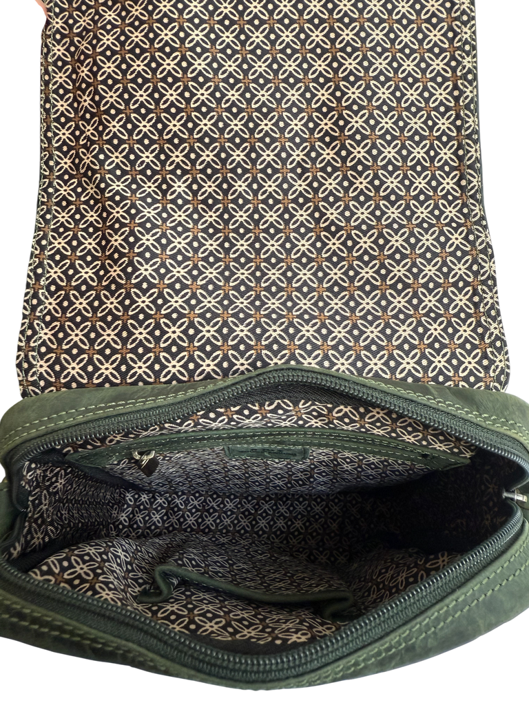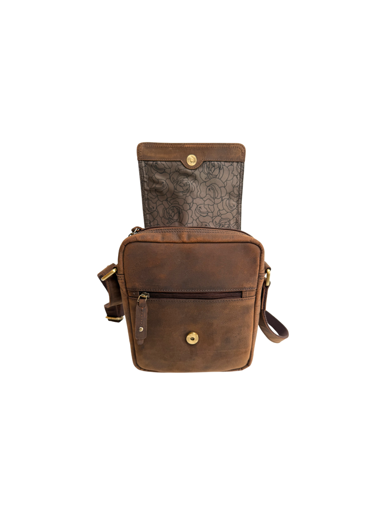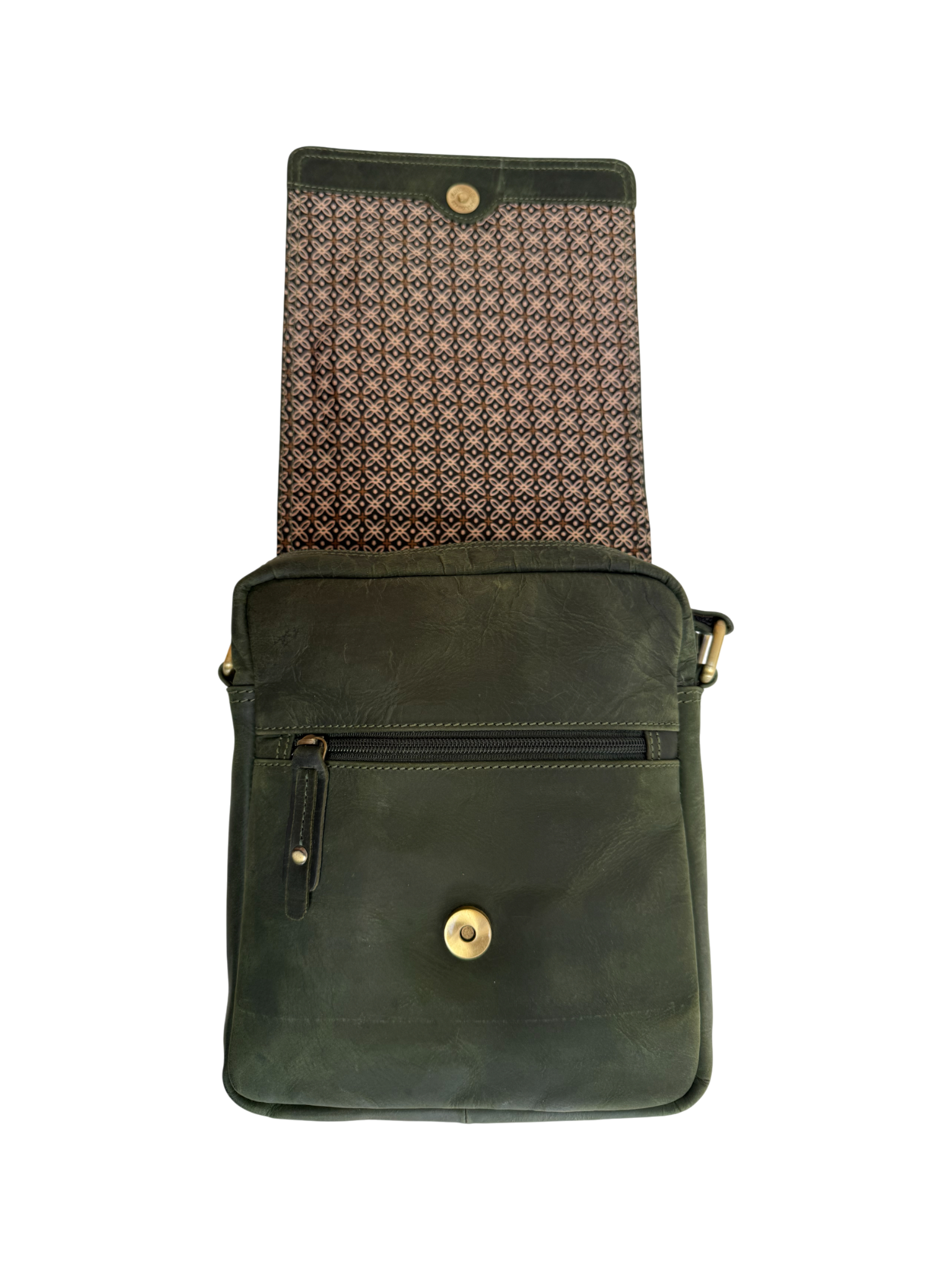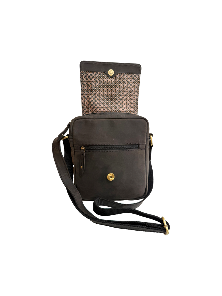 The sleek front flap with magnetic button fastening keeps your belongings secure while maintaining a clean, modern look. Beneath the flap, a discreet front zip compartment offers convenient access to essentials. Inside, you’ll find a spacious main section with an interior zip pocket and a mobile storage pouch, ensuring everything stays neatly organised. A rear zip compartment provides extra space to keep your valuables safe.
